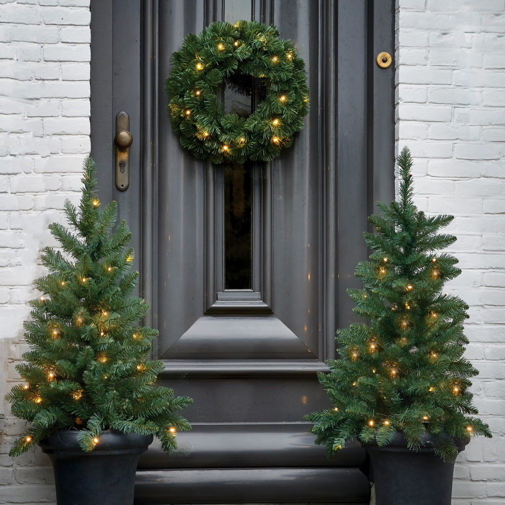 Dekorieren Sie Ihren Hauseingangsbereich stimmungsvoll mit den beiden beleuchteten Bäumchen (in einem anthrazitfarbenenTopf) sowie einem beleuchteten Türkranz.
